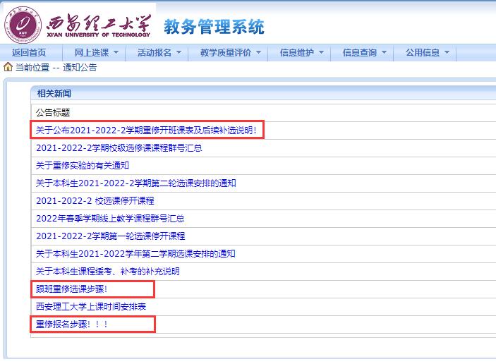 1、请相关同学登录学分制主页(忘记密码者请通过QQ直接发送:“重置密码+学号”给教学科刘老师),详细阅读相关通知,重点通知已用红框标出;
