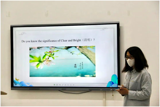 首先,员工到达教室分组落座后观看有关二十四节气的小视频,Hayley老师向同学们介绍中国二十四节气概述以及相关英语名称表达。随后,老师给出诗句,现场员工根据语境判断是哪一种节气,并以英汉互译的形式,加深同学们对节气的理解与掌握。